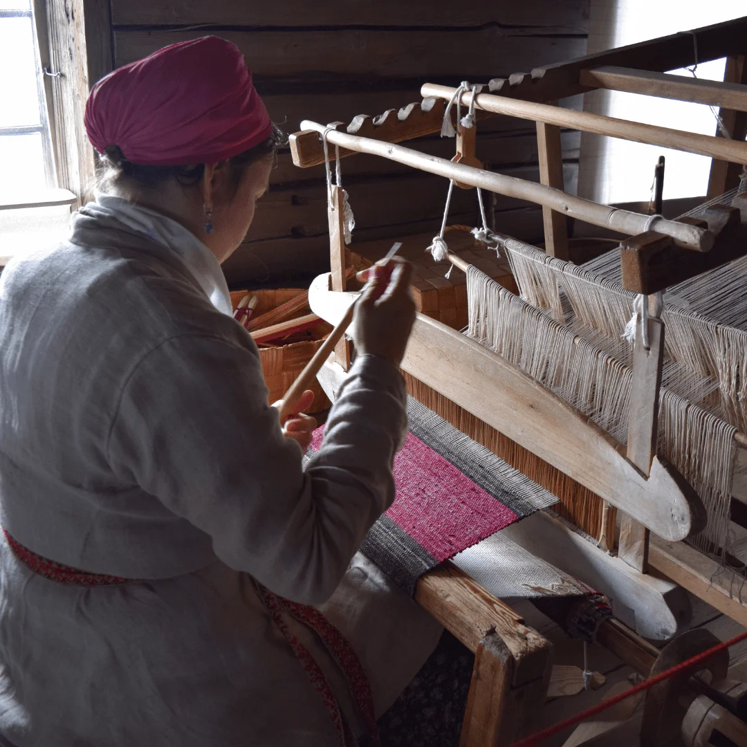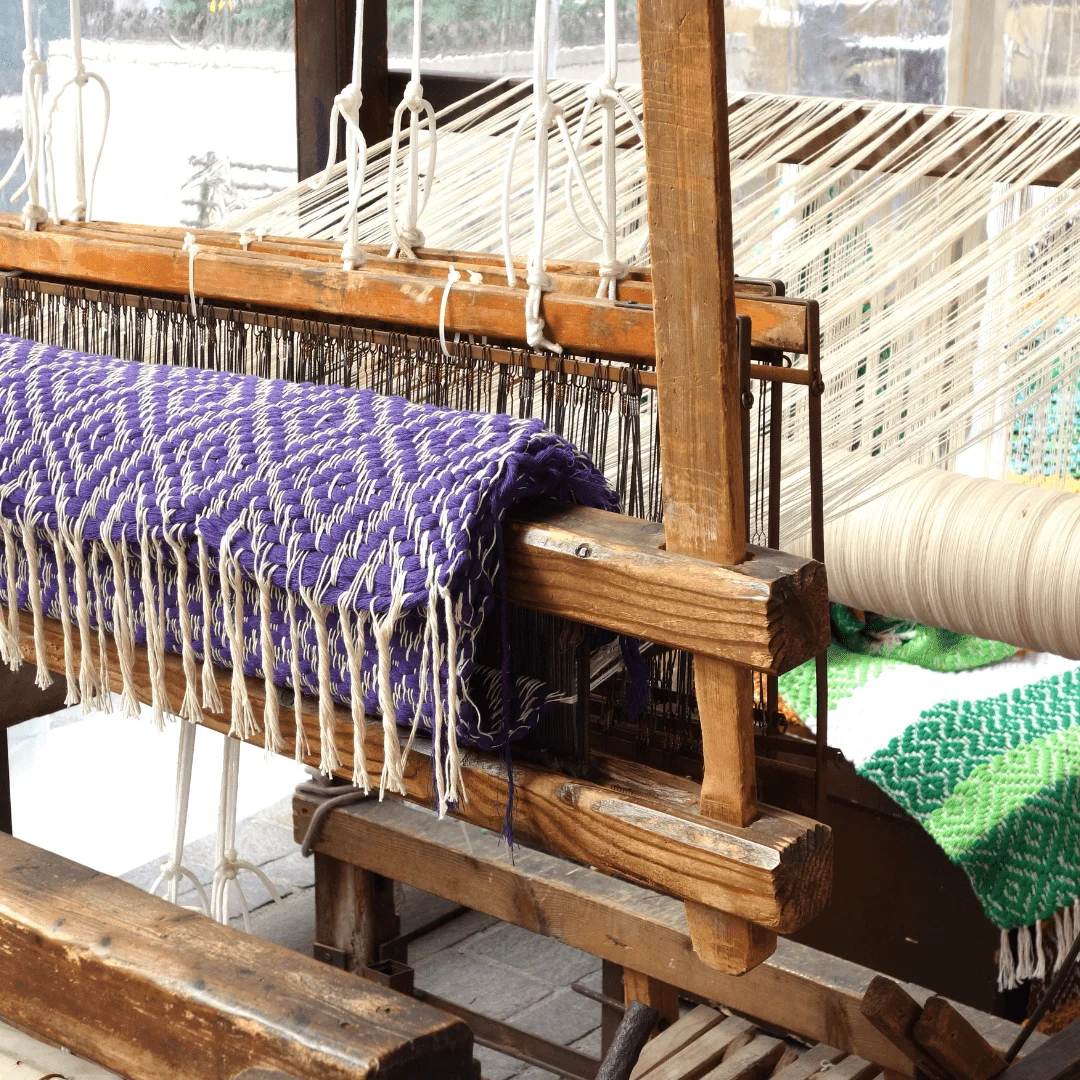 The weft thread is passed over and under the warp to build the fabric’s pattern. Each movement creates rhythm, texture, and the unique character of the weave.